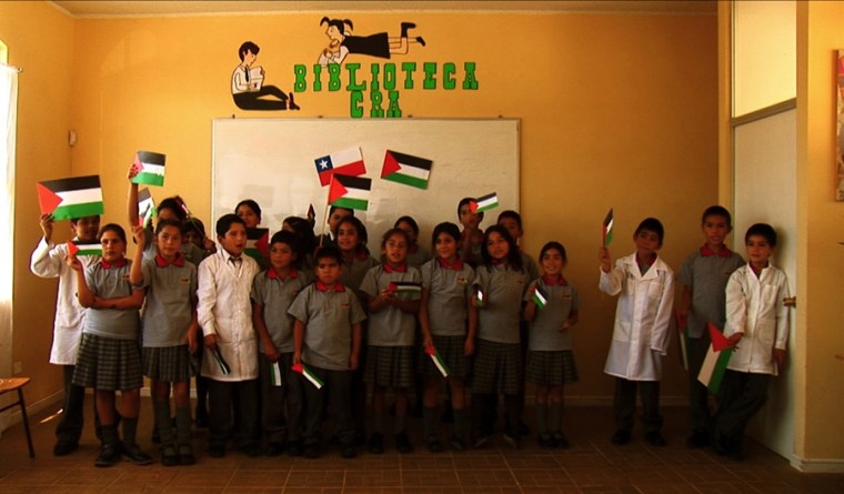 Initially, the spectator is confronted with an admirable level of sympathy and action from La Calera; the sight of children at a Chilean school (‘The Palestine School’) first singing the Palestinian national anthem and then making Palestinian flags so that the “pain” of the Palestinian children is turned into “love” is quite moving. This is continued and perhaps intensified somewhat in the segment in which Chileans are filmed chasing a bus of Palestinian refugees waving Palestinian flags, again an emotional moment. This portrayal of unadulterated empathy is compromised, however, once the refugees actually appear on screen: the camera focuses on their expressions, and their discomfort is evident in the face of this overwhelming display of hospitality, understandable once the reasons for their arrival to La Calera is considered.